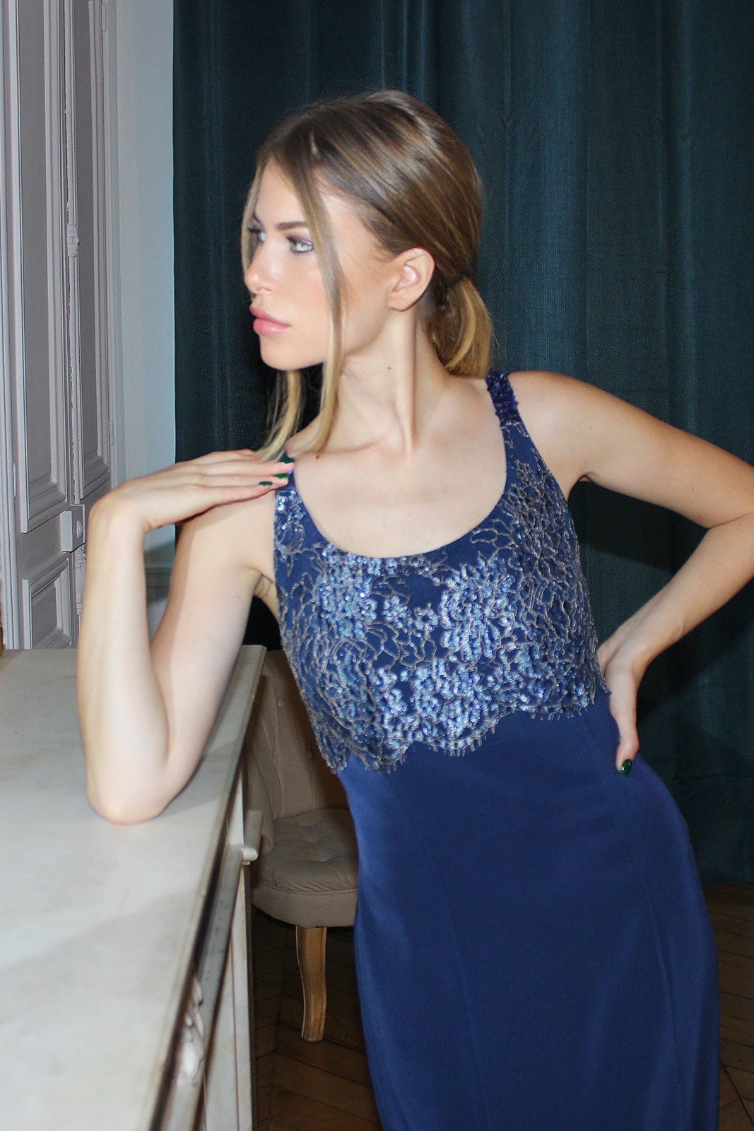 Robe de soirée sans manche et buste en dentelle de Calais Caudry LAGUNE