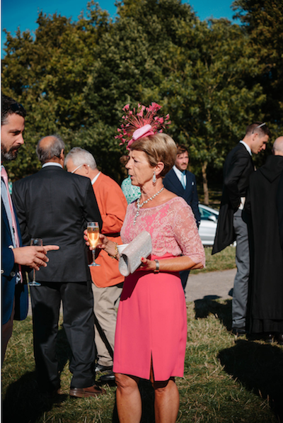 Pour parfaire cette tenue, nous avons créé un bibi assorti de couleur rose, réalisé à la main dans notre atelier. Ce petit chapeau, orné de délicates fleurs de soie / plumes légères, ajoutait une note de sophistication et complétait harmonieusement la robe. Le bibi, posé avec soin, était la touche finale qui faisait toute la différence, transformant une belle tenue en une création véritablement unique.
