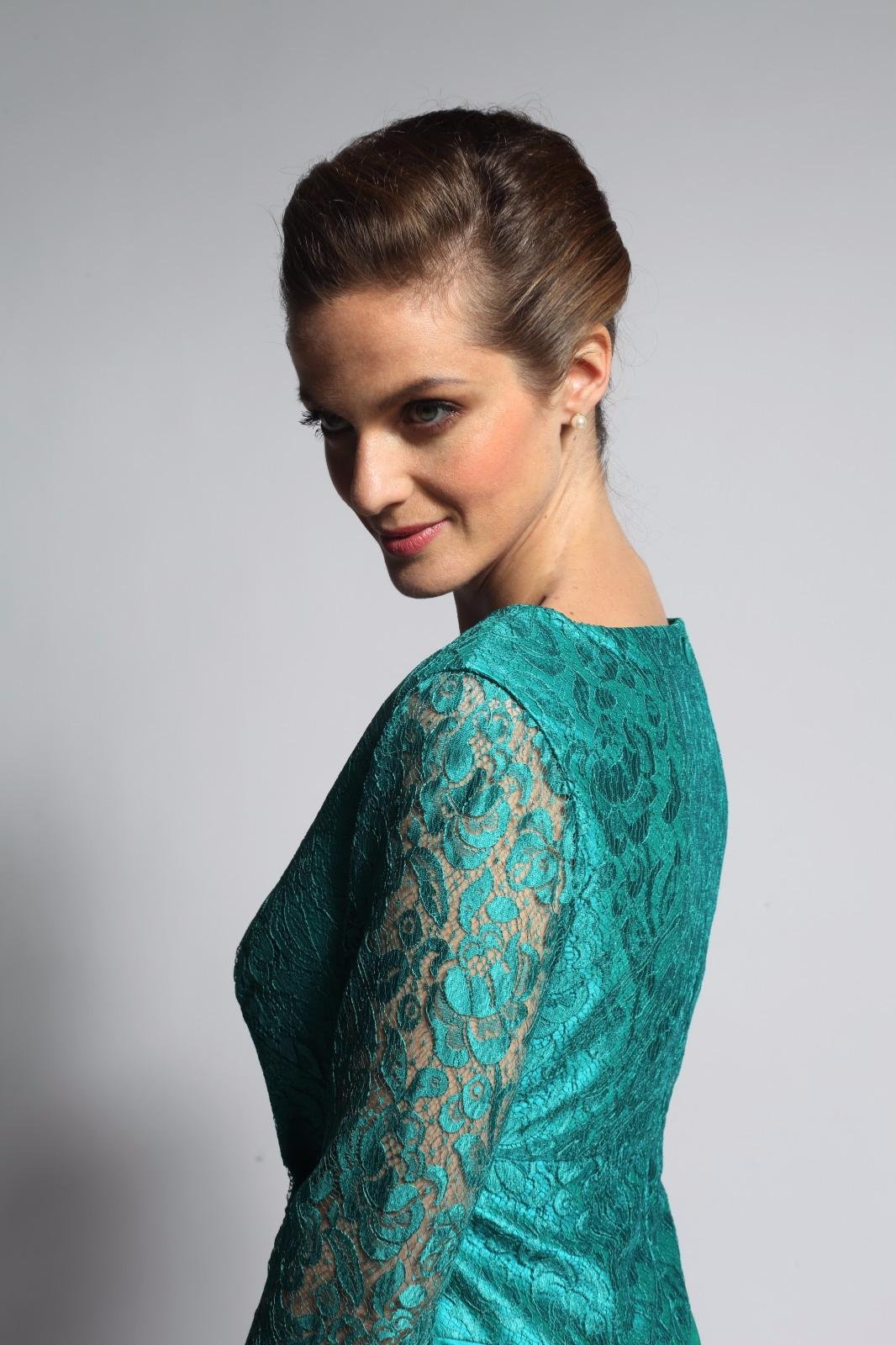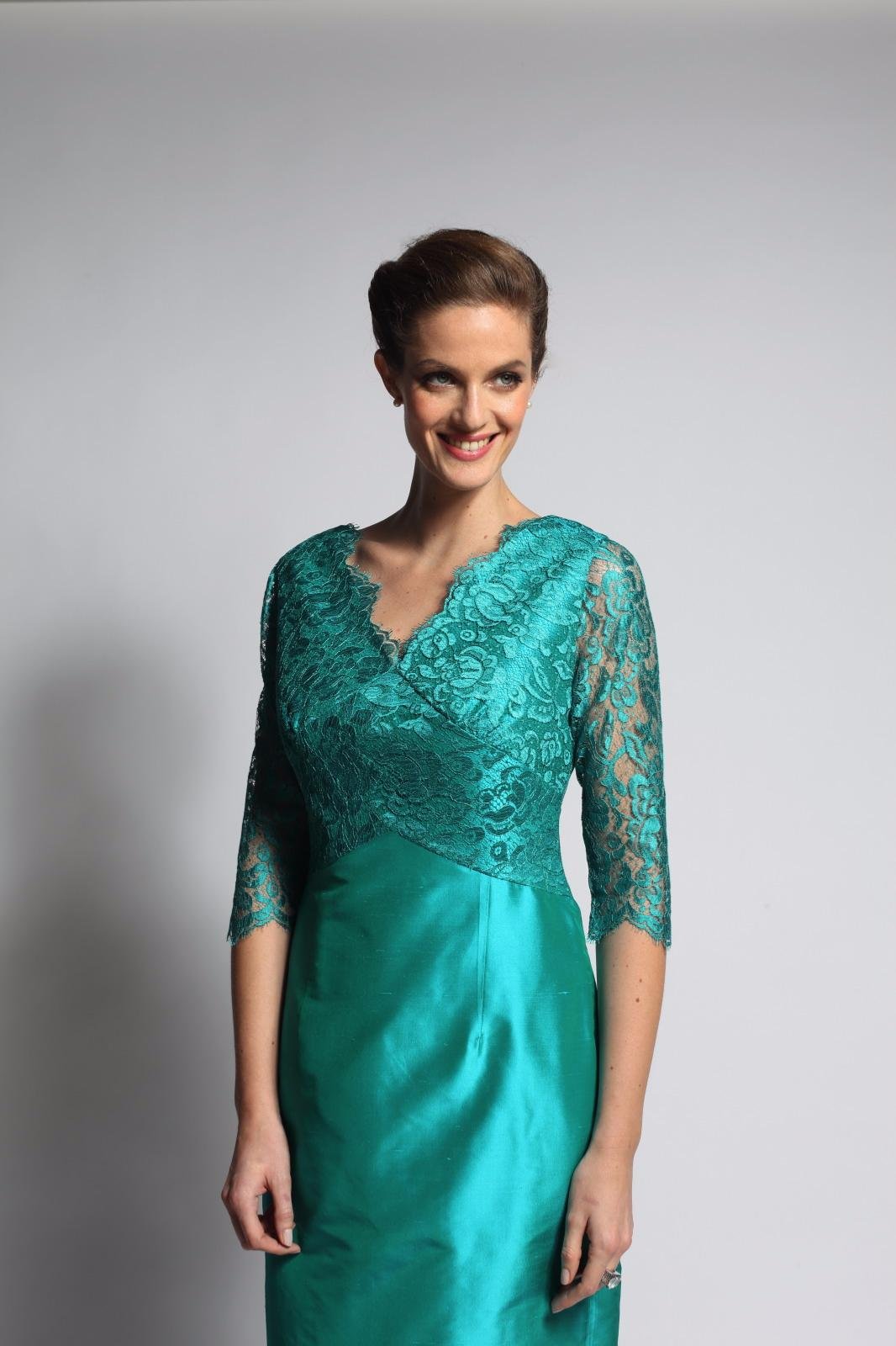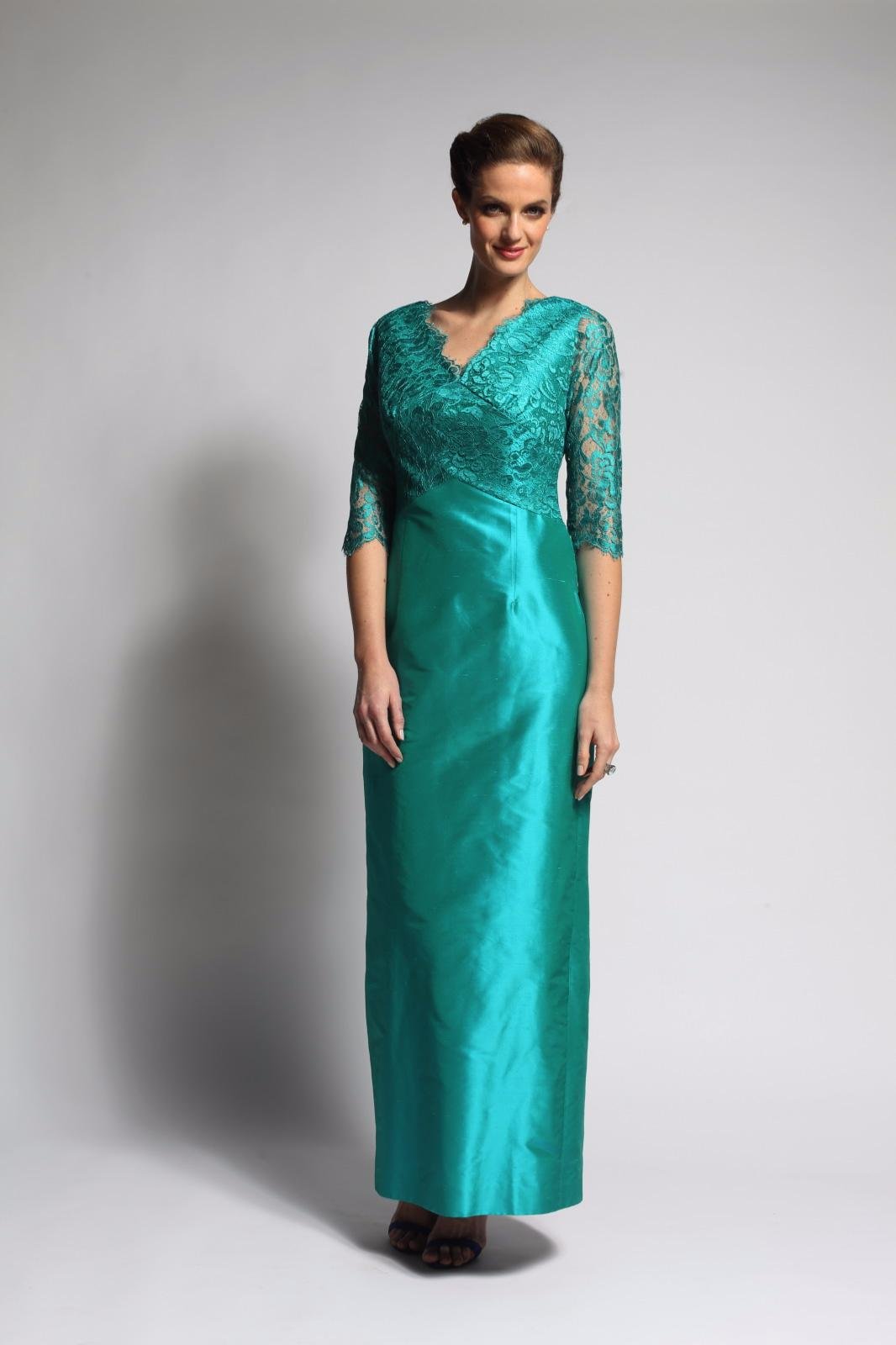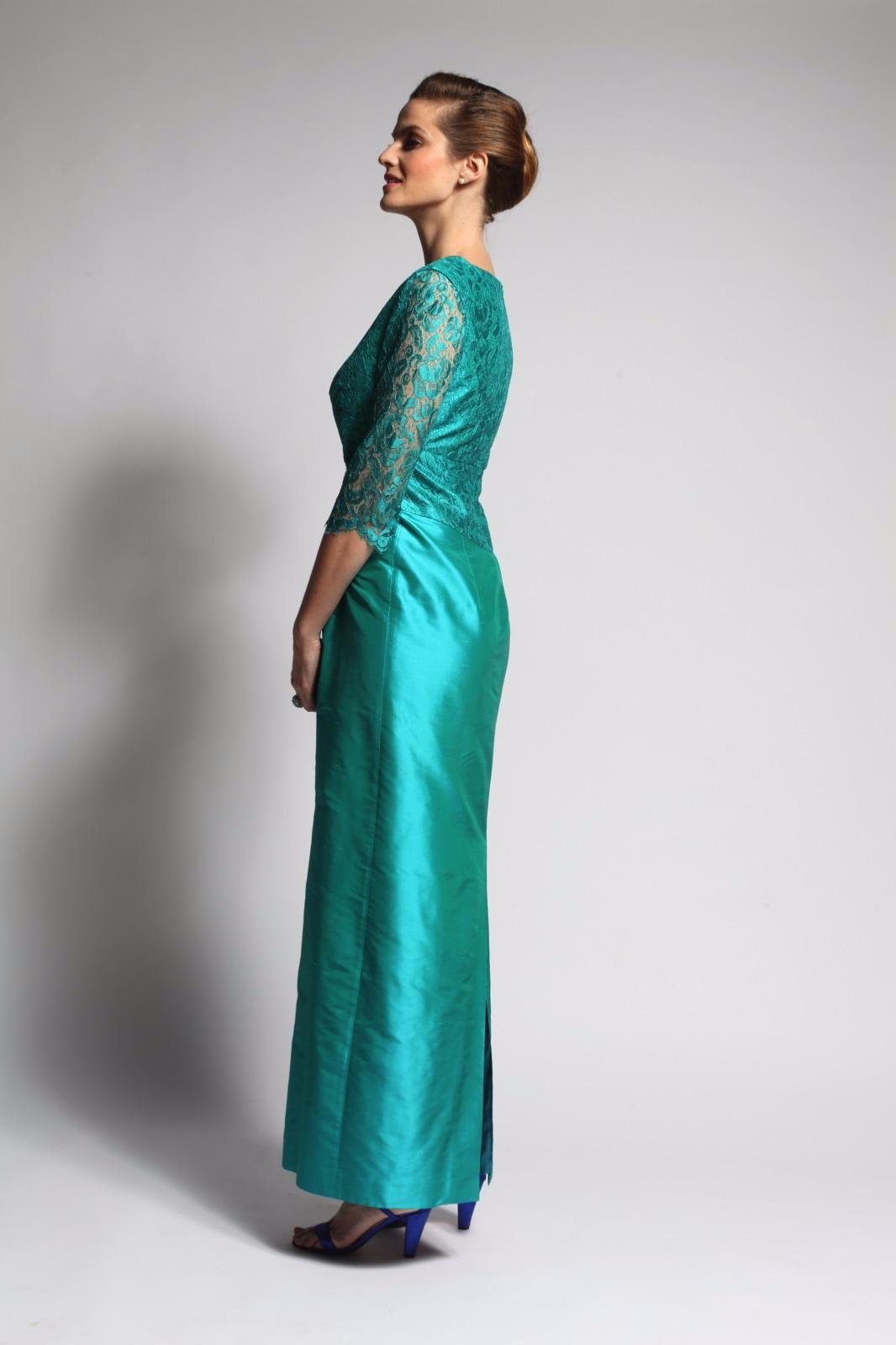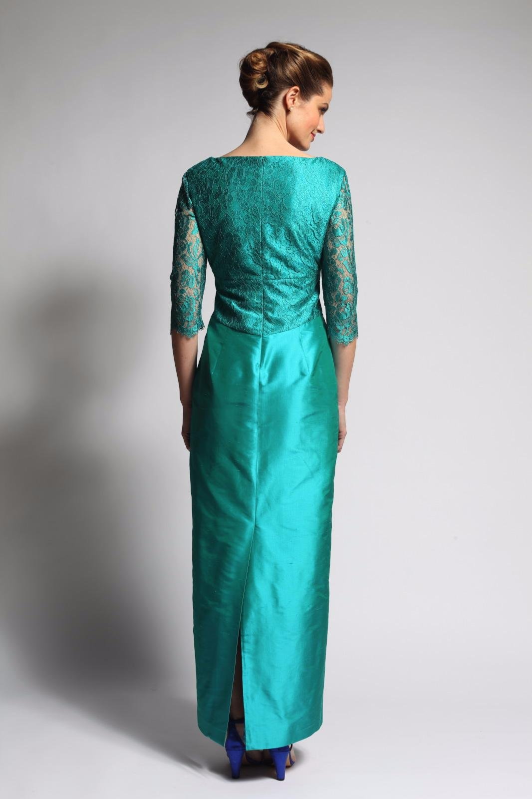 Robe longue en soie avec manches trois-quart en dentelle de Calais.