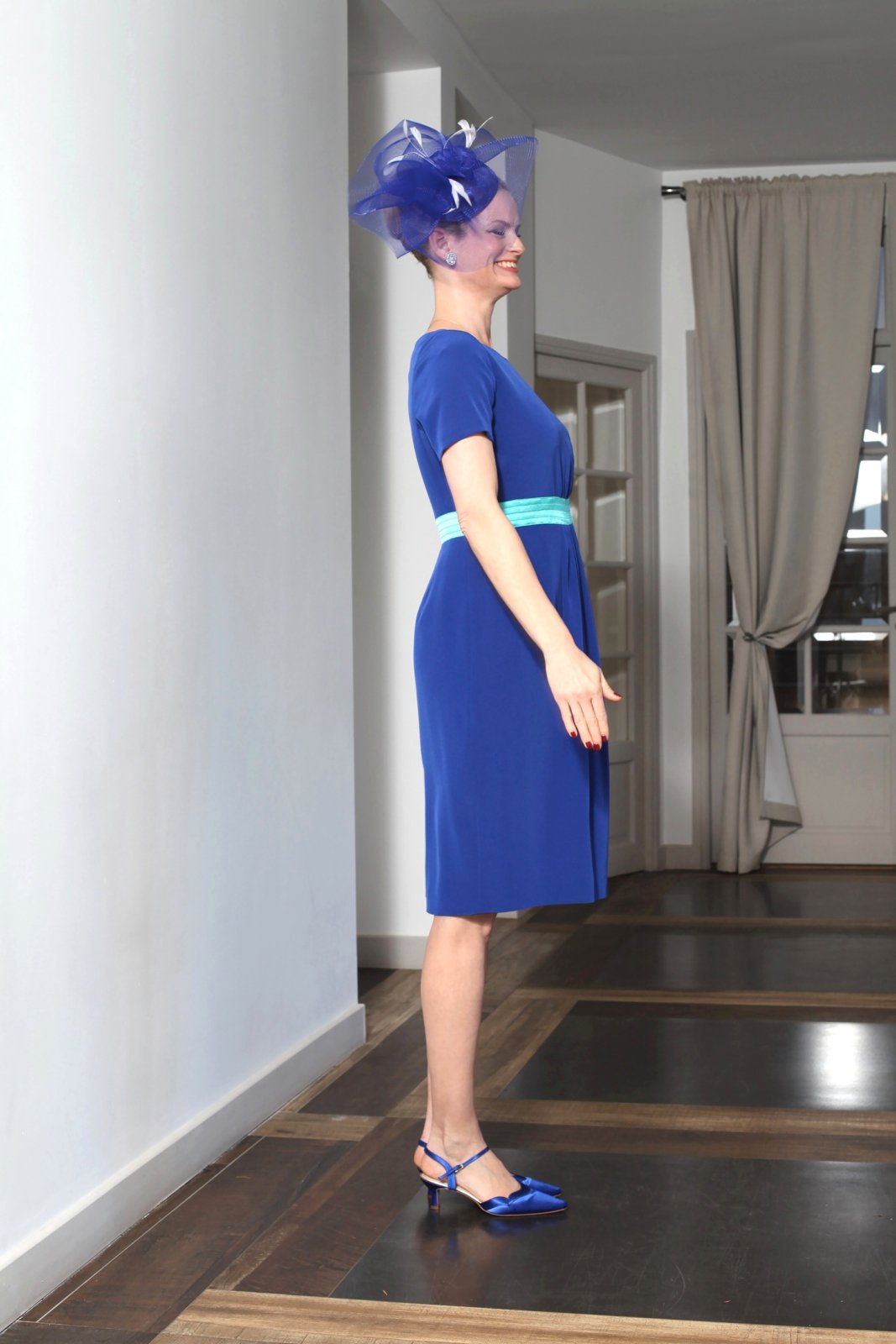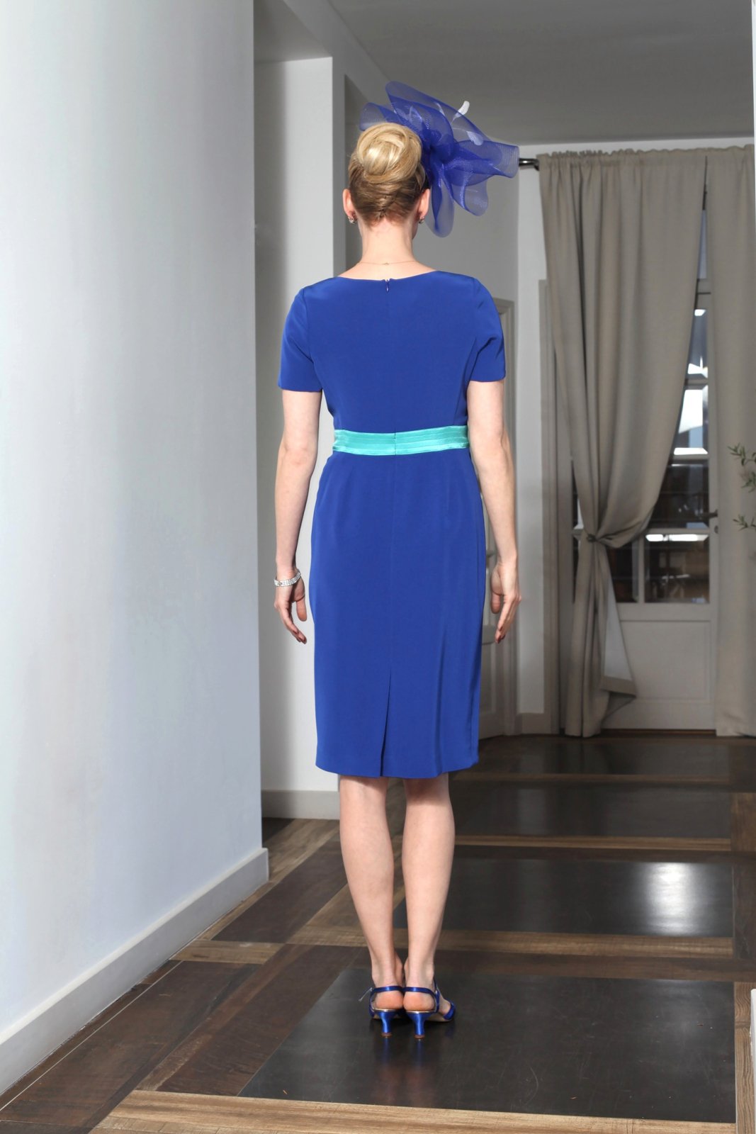 Robe courte de cocktail avec de petites manches, en crêpe fluide et souple, au style simple et très féminin. Sa ceinture en satin au coloris contrasté maintient de petits plis qui apportent confort et souplesse à cette robe légèrement entravée. Une belle encolure bateau pas trop large mettra en valeur votre port altier. Proposée ici dans un coloris de bleu profond Majorelle idéal pour une cérémonie ou un mariage très bord de mer.