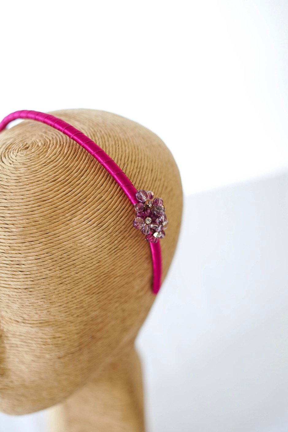 Serre tête bijoux pour tenue de mariage ou cocktail, perles coloris magenta.