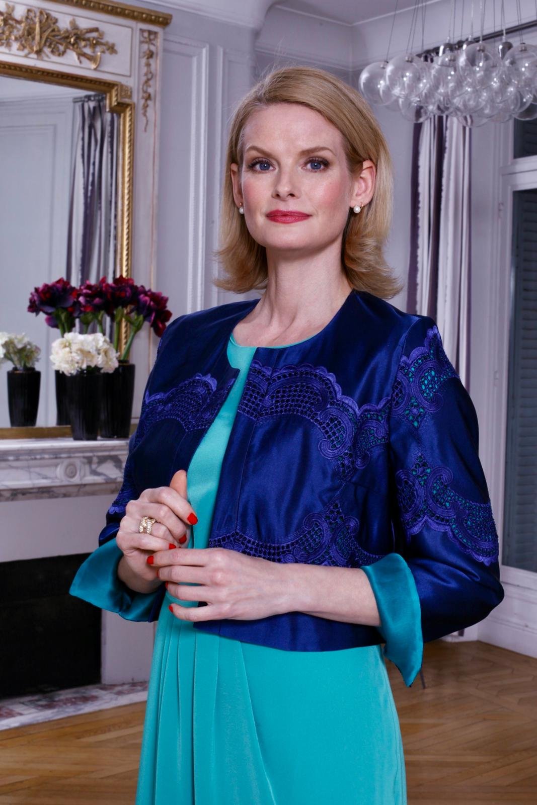 Un style féminin très glamour pour cette veste THERESE réalisée dans une superbe broderie anglaise au coloris dense, idéale pour une cérémonie au bord de la mer ou un mariage estival.