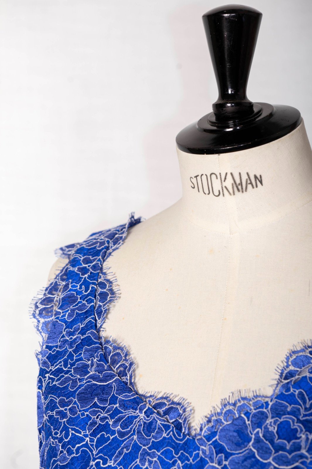 Sans manche et encolure en V pour mettre en valeur votre décolleté, elle est entièrement recouverte de dentelle de Calais-Caudry au motif de grandes roses coloris bleu et blanc, avec écaille de la dentelle qui borde les emmanchures et l’encolure.