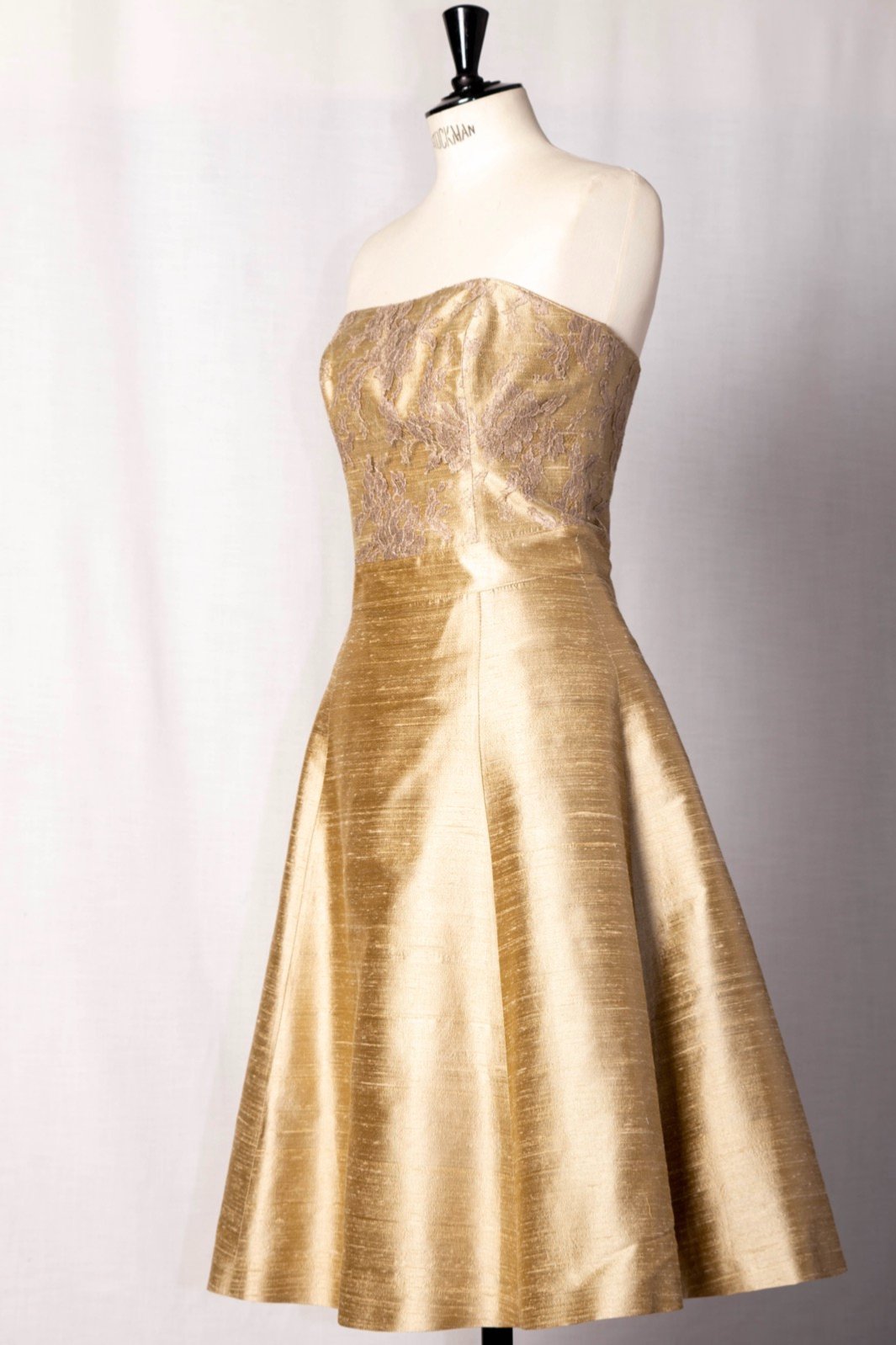 Superbe robe de cocktail avec empiècement haut recouvert dune exceptionnelle dentelle de Calais aux reflets irisés.