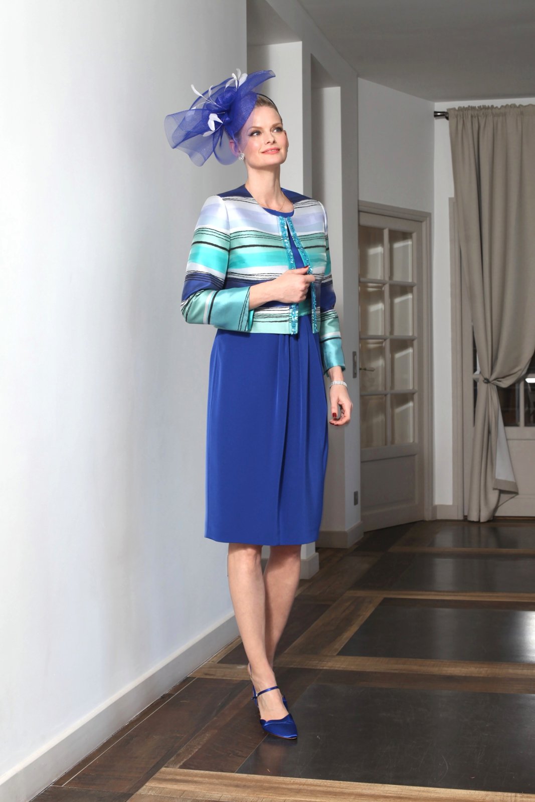 Très élégant tailleur robe pour un mariage raffiné et chic. Pour accompagner une robe féminine en crêpe souple et confortable, voici une très belle veste à encolure ronde et manches trois quarts réalisée dans un magnifique Jacquard à rayures effet peinture.
