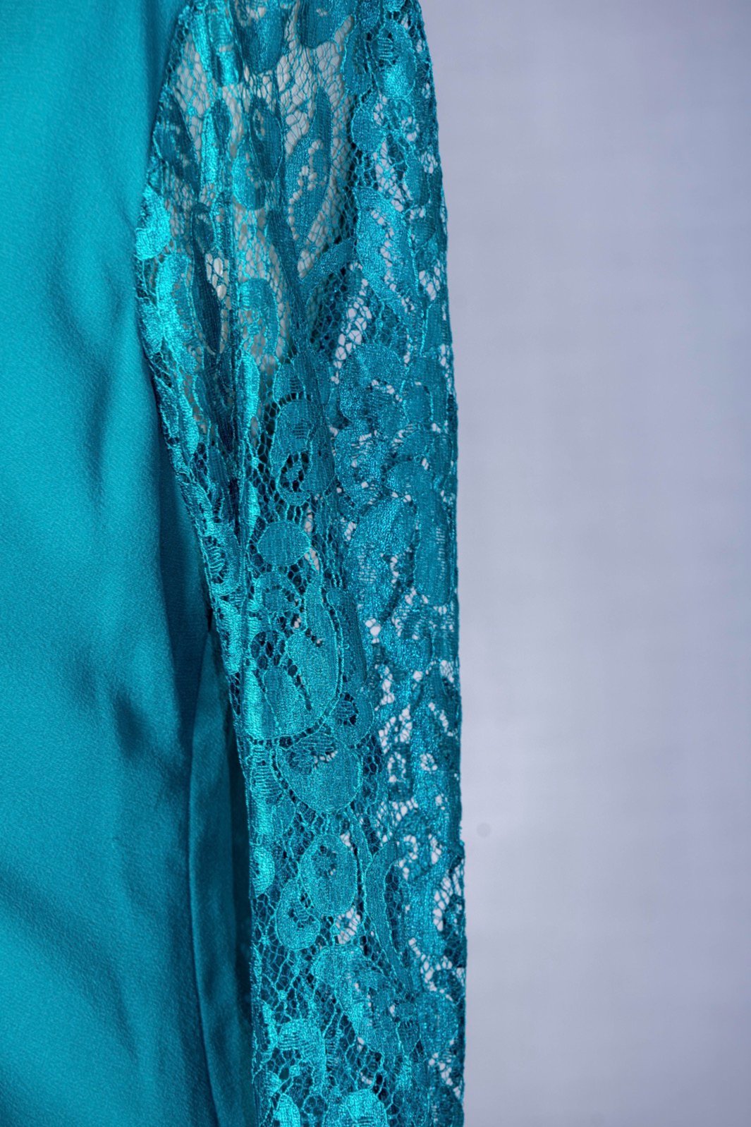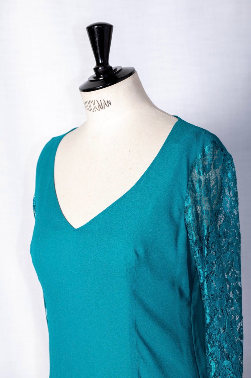 Superbe top à manches longues en dentelle de Calais fleurs romantiques rose poudré ourlé de noir, doublé de soie avec encolure généreuse bordée de l’écaille de la dentelle.