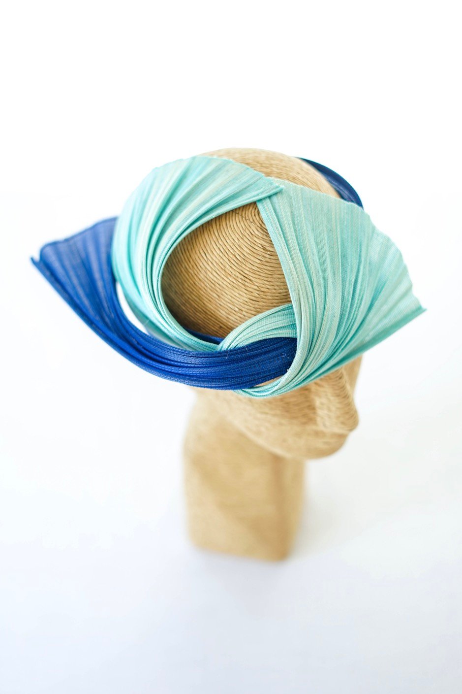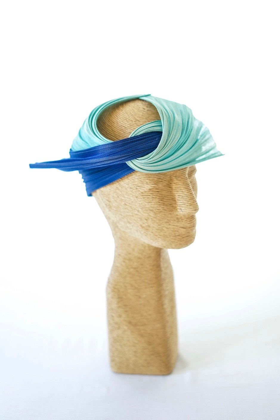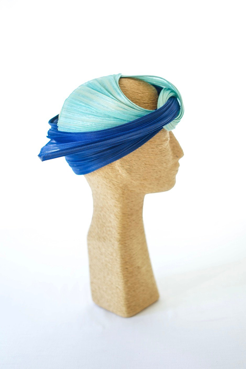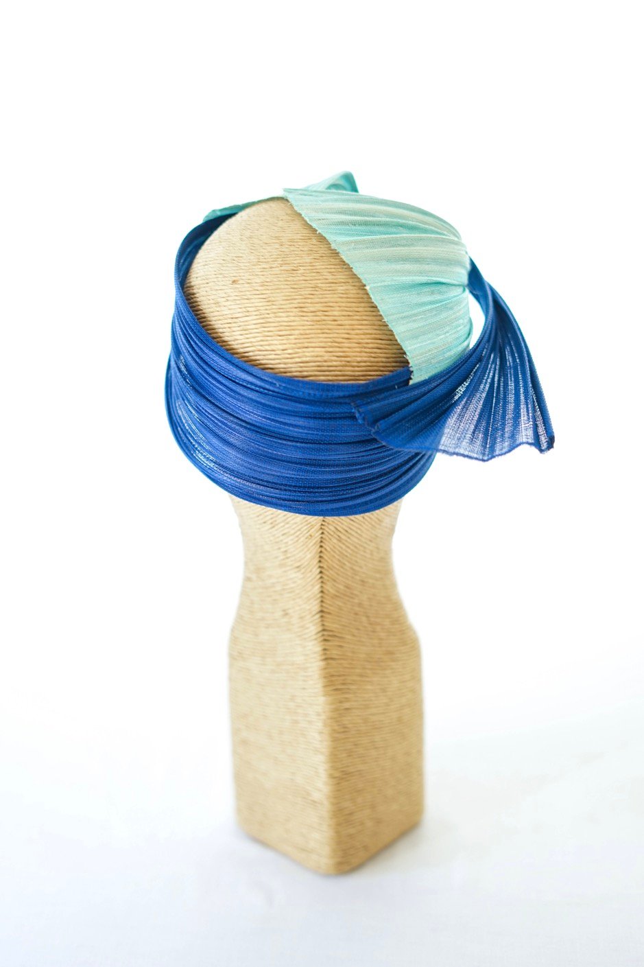 Coiffe mariage turban MISIA OFELIE indigo en plissé buntal ,élégante et sophistiquée. Pour toutes cérémonies habillées.