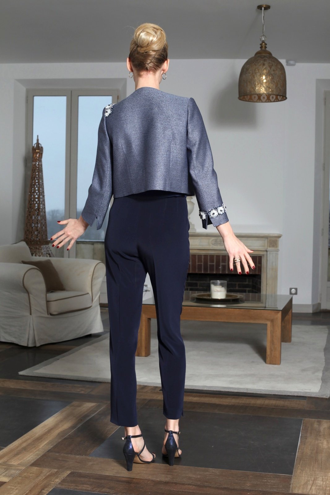 Véritable pièce de haute couture en lainage façon bleu denim, elle est gansée de galons perlés main au motif floral en véritable nacre rehaussé de paillettes, et ses bords sont entièrement recouverts de tulle brodé avec sequins et perles de rocaille.