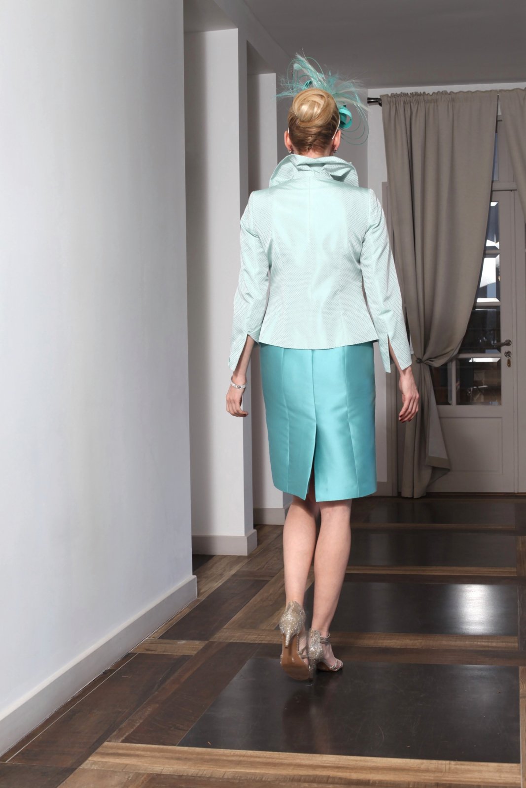 Veste de tailleur cintrée à large col drapé style Medicis qui se porte relevé grâce à des baleines souples, en taffetas soyeux à petit motif damassé.