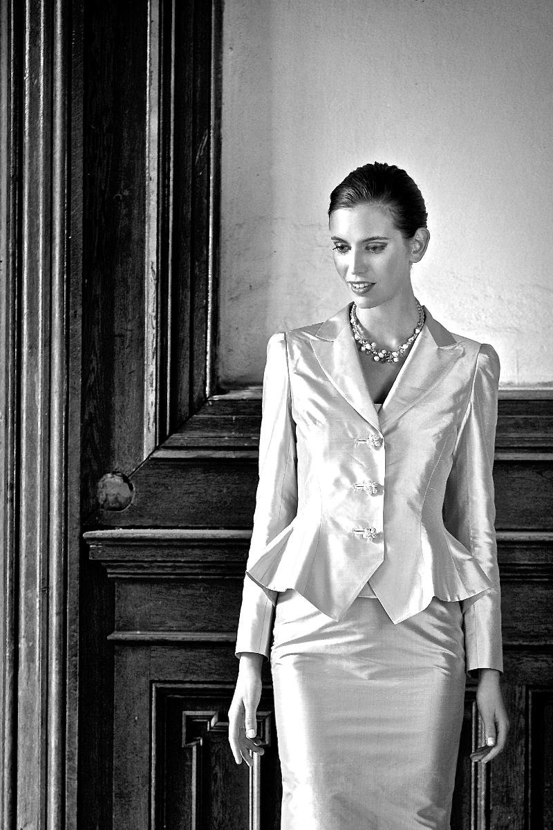 Superbe alternative pour une tenue habillée sophistiquée avec cette veste esprit smoking avec large col tailleur en soie sauvage. Sa taille cintrée est marquée par une basque à petits volants. Le boutonnage de cette veste d’exception est remarquable: les boutons en perles sont de vrais bijoux! Vous pouvez la porter avec une robe 3 trous coordonnée ou une jupe plate longue et fendue milieu dos.